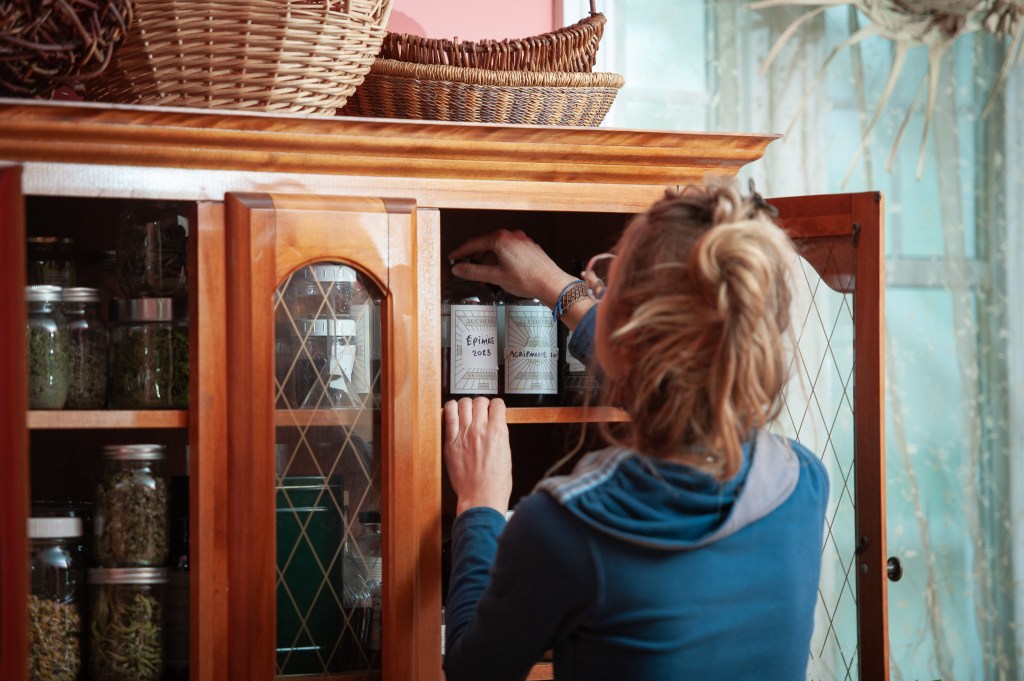 Mon armoire d’herboristerie artisanale – plantes de mon jardin en macération, disponibles en synergies et mélanges personnalisés. Fabriqués avec Amour !
