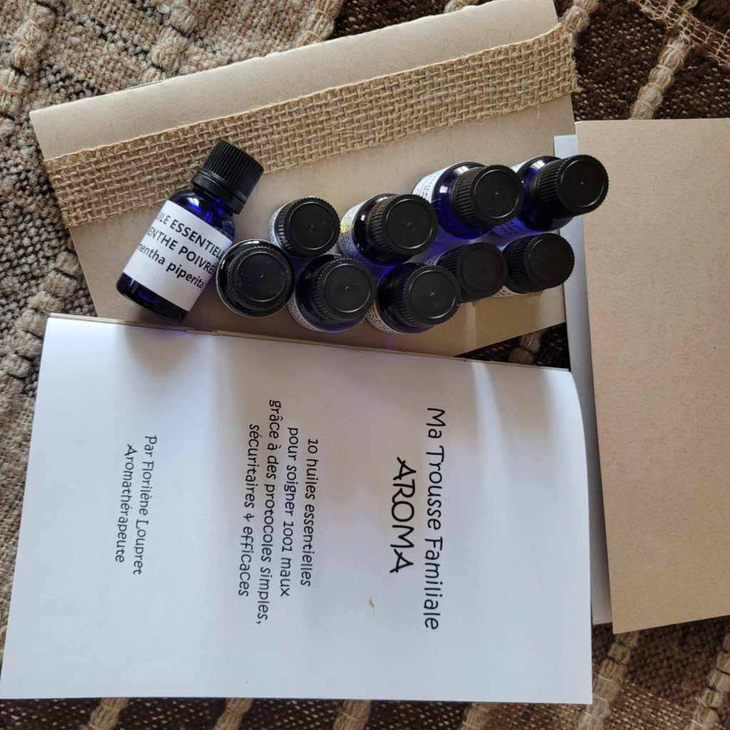 Coffret découverte contenant les 10 huiles essentielles présentées dans le livre en format 5ml plus le livre. 60$.